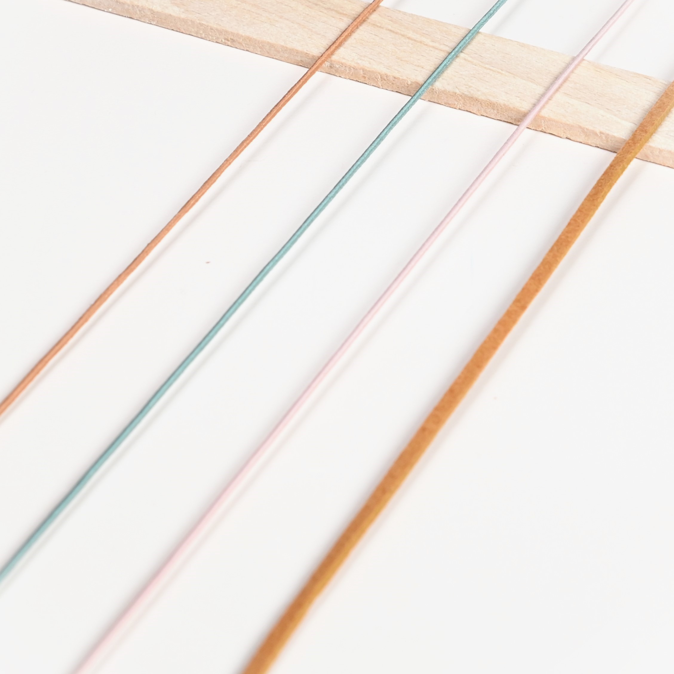 Sampleset van drie kleuren elastisch koord: saliegroen, oudroze en roestbruin & cognackleurig suède koord.