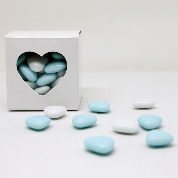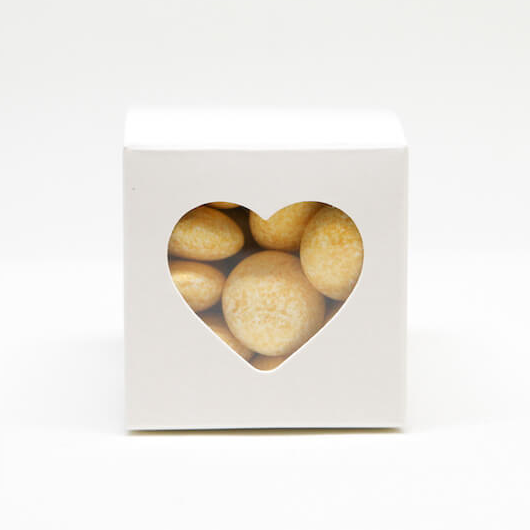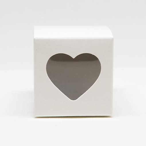 Wit doosje met doorschijnend hartje, waar je het snoep doorheen kunt zien. Leuk als doopsuiker of bedankje. Het doosje is 5 cm hoog, breed en diep en wordt ongevouwen en leeg geleverd.